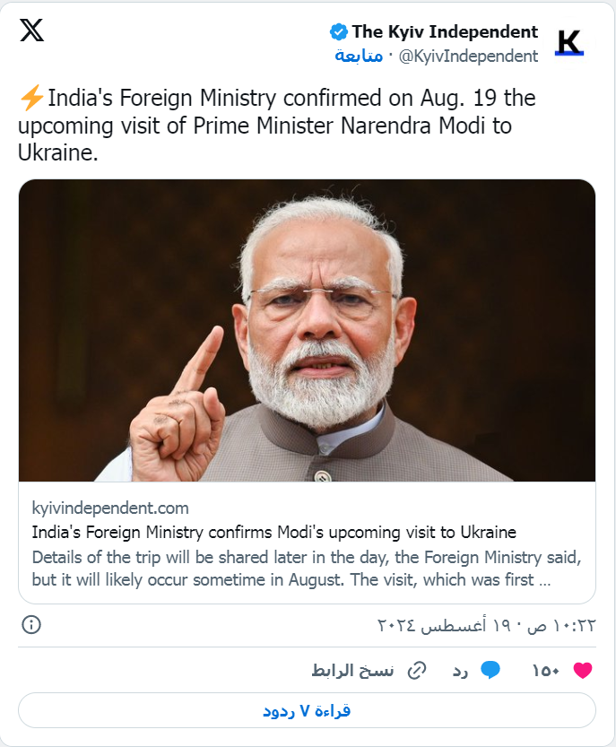 أعلنت وزارة الخارجية الهندية اليوم الإثنين، أن رئيس الوزراء ناريندرا مودي سيزور أوكرانيا، بعد أسابيع من تنديد كييف به لمعانقته الرئيس الروسي فلاديمير بوتين خلال زيارة إلى روسيا، الحليف التقليدي للهند.ولم تحدد وزارة الخارجية موعداً لـ”الزيارة إلى بولندا وأوكرانيا” لكن وسائل إعلام هندية أوردت أنها قد تجري لاحقاً هذا الأسبوع.