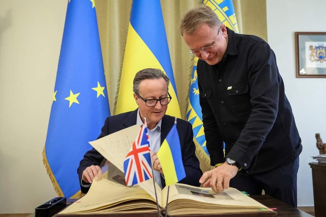 وزير الخارجية البريطاني ديفيد كاميرون لدى زيارته مدينة لفيف الأوكرانية وإلى جانبه عمدة المدينة أندريه سادوفيي، في 3 مايو الحالي (رويترز)