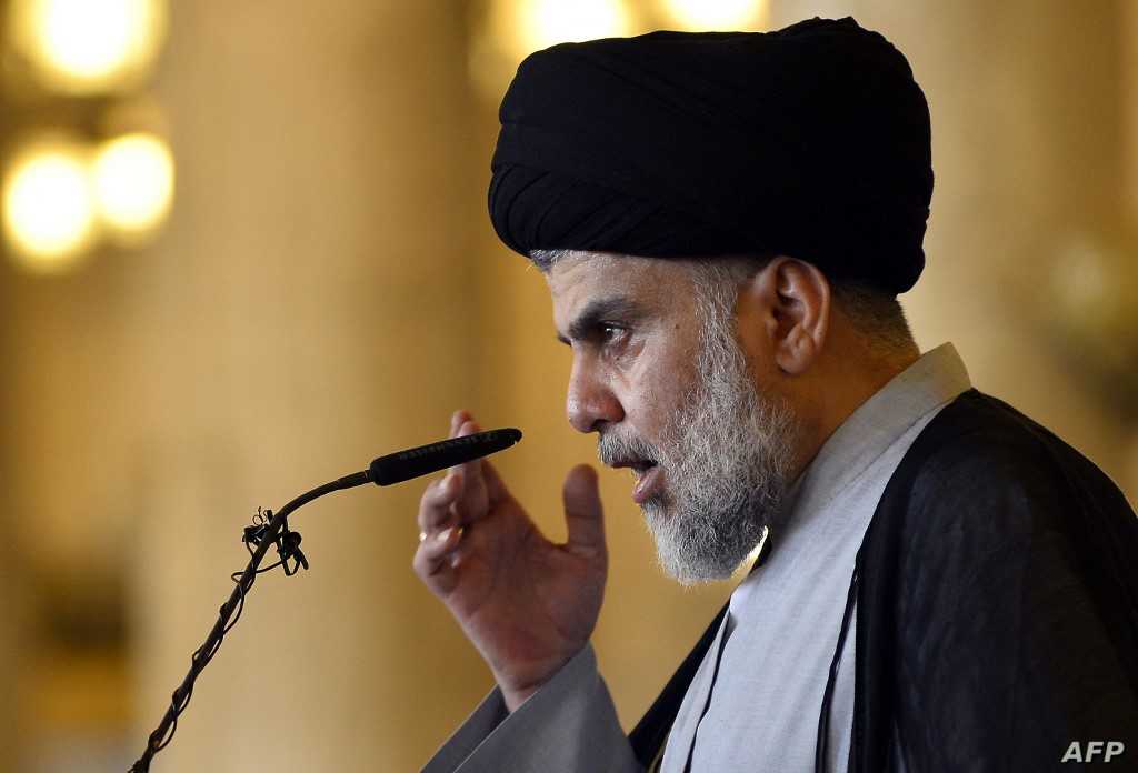 Iraqi Shiite cleric and political leader Moqtada al-Sadr delivers the Eid al-Fitr sermon during the Muslim holiday's morning prayer at the Grand Mosque of Kufa near the central Iraqi shrine city of Najaf, some 160 kilometres south of the capital Baghdad, on June 05, 2019. - Muslims worldwide are celebrating Eid al-Fitr marking the end of the fasting month of Ramadan. (Photo by Haidar HAMDANI / AFP)