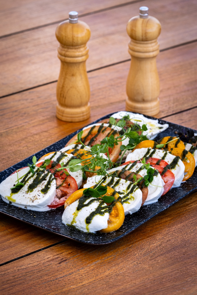 - تقطع الطماطم والجبنة إلى شرائح، ثم تصف بالتناوب في الطبق، مرة شريحة طماطم، ومرة جبنة.