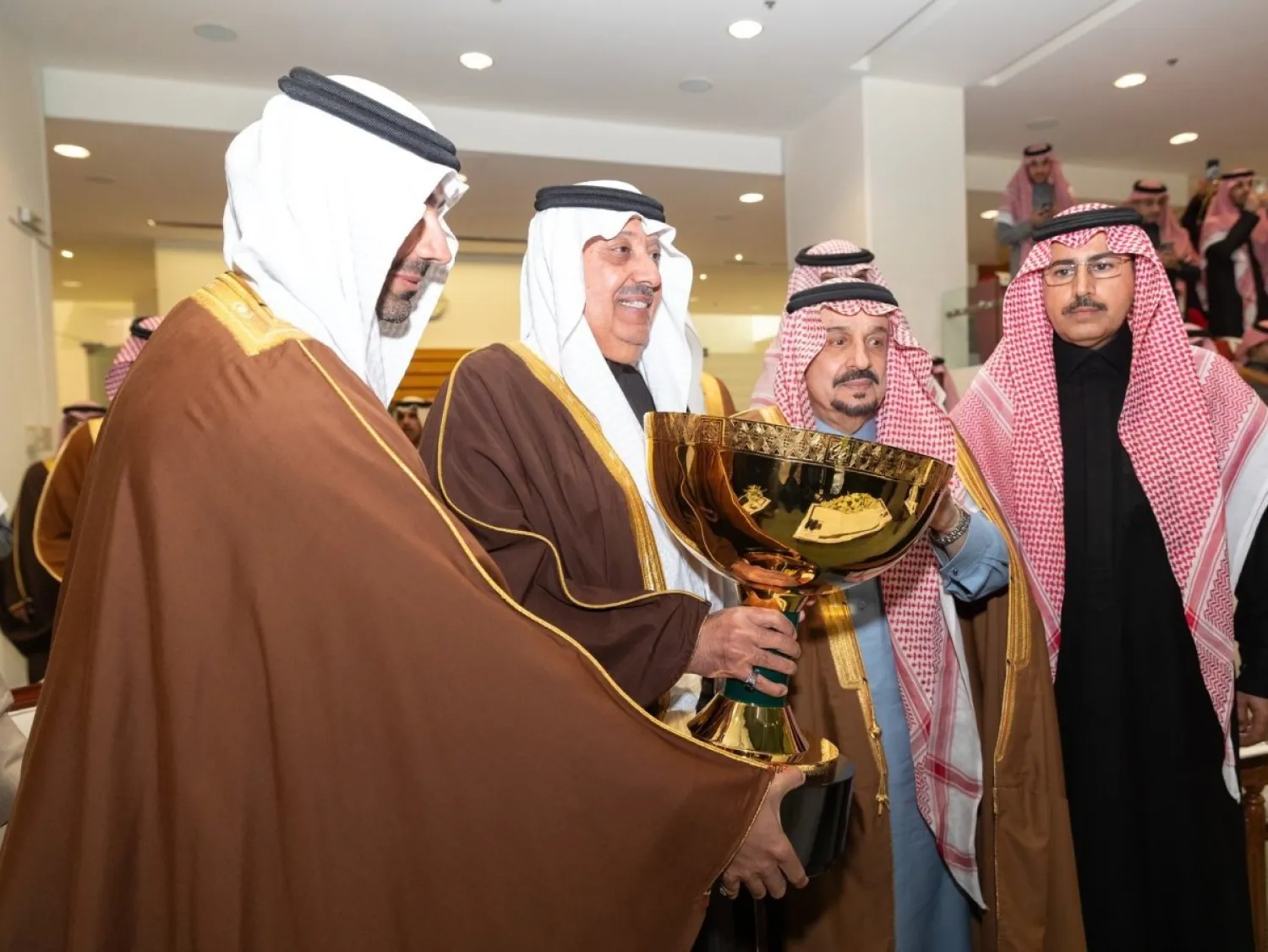 وحلّق سيف برزان بكأس الملك عبد العزيز (المؤسس) للخيل العربية الأصيلة -الإنتاج المحلي- وسلّم الأمير فيصل بن بندر الكأس للمالك متعب صالح المزيد.