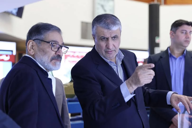 صورة نشرتها المنظمة الإيرانية للطاقة الذرية لرئيسها محمد إسلامي لدى استقباله شمخاني في معرض للصناعة النووية أبريل الماضي
