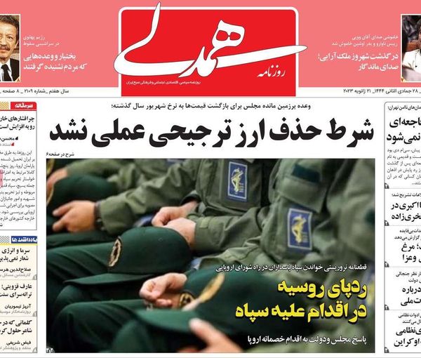 لا يزال إعلان البرلمان الأوروبي، أول من أمس الخميس، الحرس الثوري الإيراني منظمة إرهابية يحتل الصدارة في اهتمام الصحف الإيرانية اليوم السبت 21 يناير (كانون الثاني).