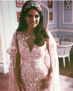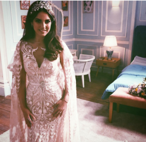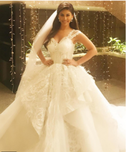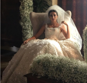 ومن فساتين زفاف النجمات في مسلسلات رمضان 2018 التي خطفت الأنظار كان فستان الفنانة فاليري أبو شقرا الذي ارتدته في أحداث مسلسل “الهيبة العودة”، فاختارت تصميماً منفوشاً مزين بالورود.
