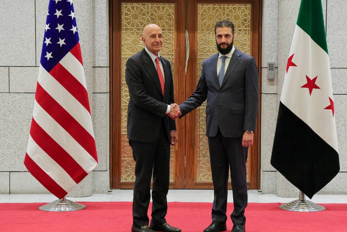 الرئيس السوري أحمد الشرع والمبعوث الأميركي الخاص إلى سوريا توم باراك (أ ف ب)