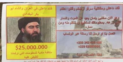 وبحسب المنشور ، رصدت الولايات المتحدة 25 مليون دولار لمن يعطي معلومات عن زعيم تنظيم داعش أبو بكر البغدادي .