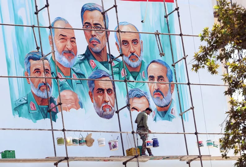 رسام يرسم لوحة على مبنى «مركز الإعلام الفلسطيني» في طهران تصور قادة عسكريين كباراً قتلوا في ضربة إسرائيلية (إ.ب.أ)