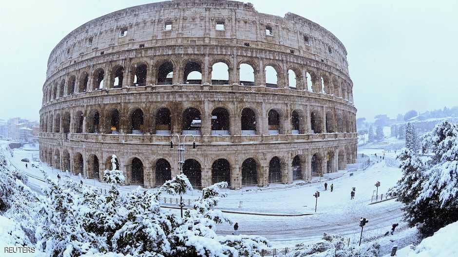 عطلت عاصفة ثلجية نادرة في روما ، حركة المواصلات، وأدت إلى إغلاق مدارس، ودفعت السلطات إلى استدعاء الجيش للمساعدة في كسح الثلوج من الشوارع.