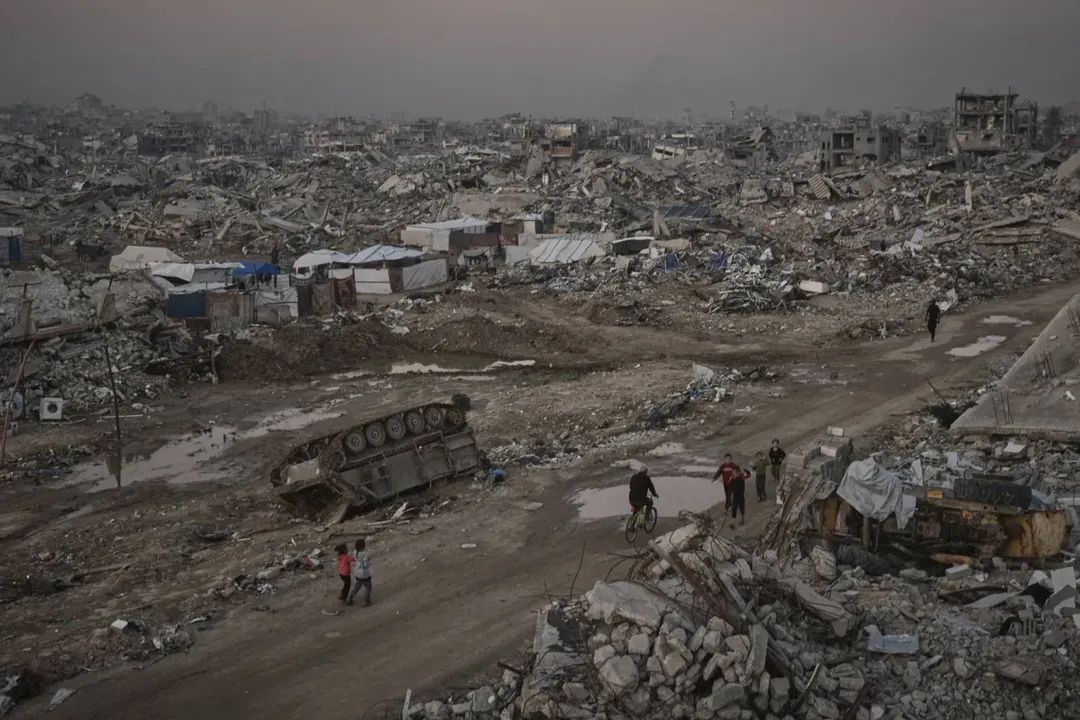 فلسطينيون يمرون قرب عربة عسكرية إسرائيلية مدمرة في مدينة غزة الخميس (أ.ب)