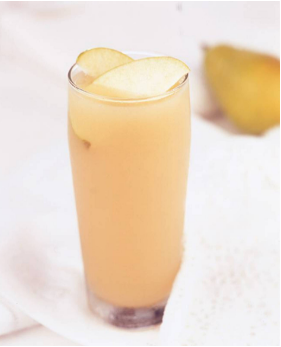 تقشر التفاحتان والموزة والإجاصتان. توضع هذه الفاكهة في خلاط الطعام وتهرس للحصول على مزيج ناعم.
