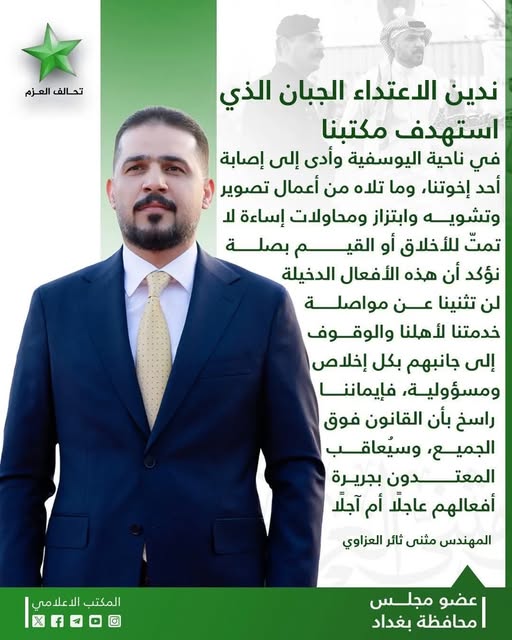 عضو مجلس بغداد المرشح مثنى العزاوي يعلن تعرض مكتبه لهجوم مسلح وإصابة شقيقه