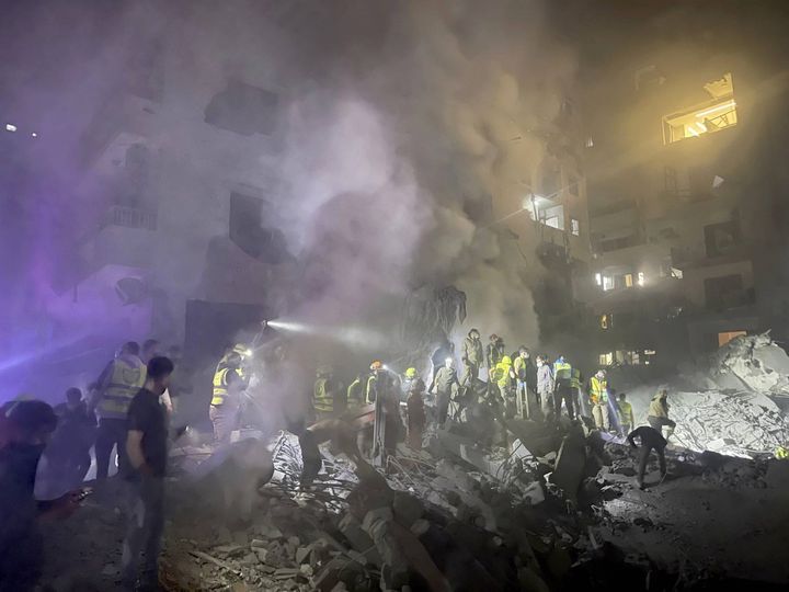 عمال إنقاذ وسكان يبحثون عن ضحايا في موقع غارة إسرائيلية في بيروت (ا.ب)