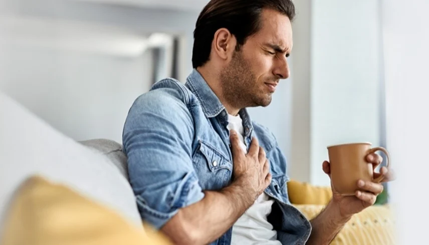 انقباض منطقة الصدر: يظهر شعور بالضغط أو الامتلاء أو الحرقان الذي يذهب ويعود، وقد يشبه أعراض عسر الهضم.