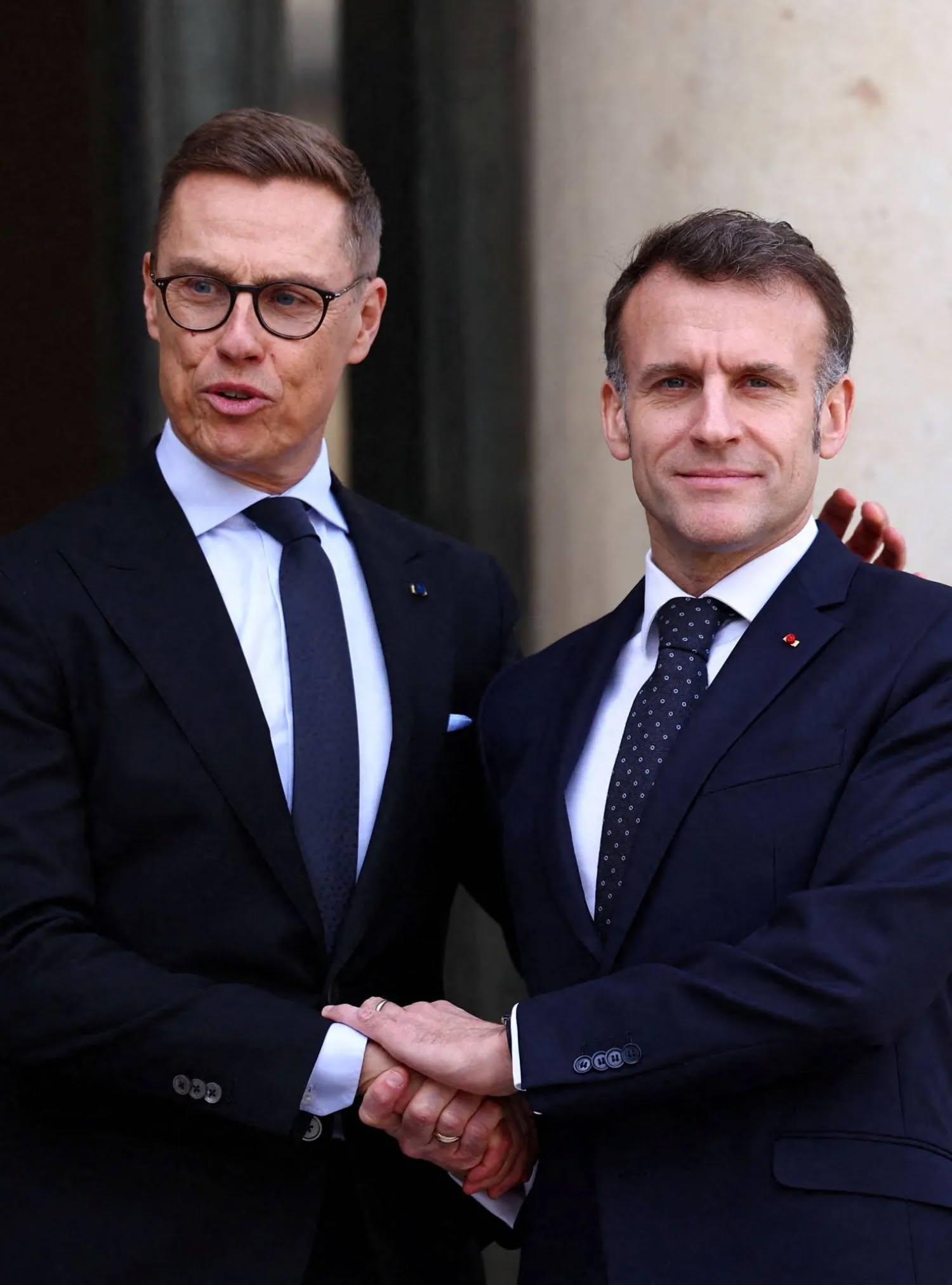 الرئيس الفرنسي إيمانويل ماكرون مصافحاً نظيره الفنلندي ألكسندر ستوب عند مدخل قصر الإليزيه في باريس الاثنين (رويترز)