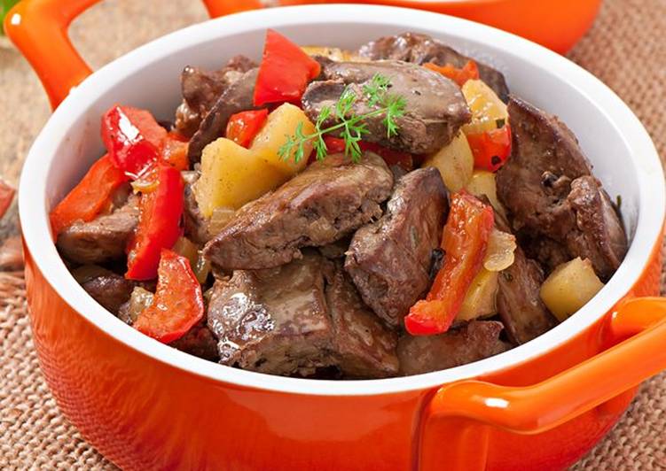 - تضاف كمية قليلة من الماء إلى الكبد والخضروات في المقلاة، وتترك المكونات حتى تغلي قليلًا.