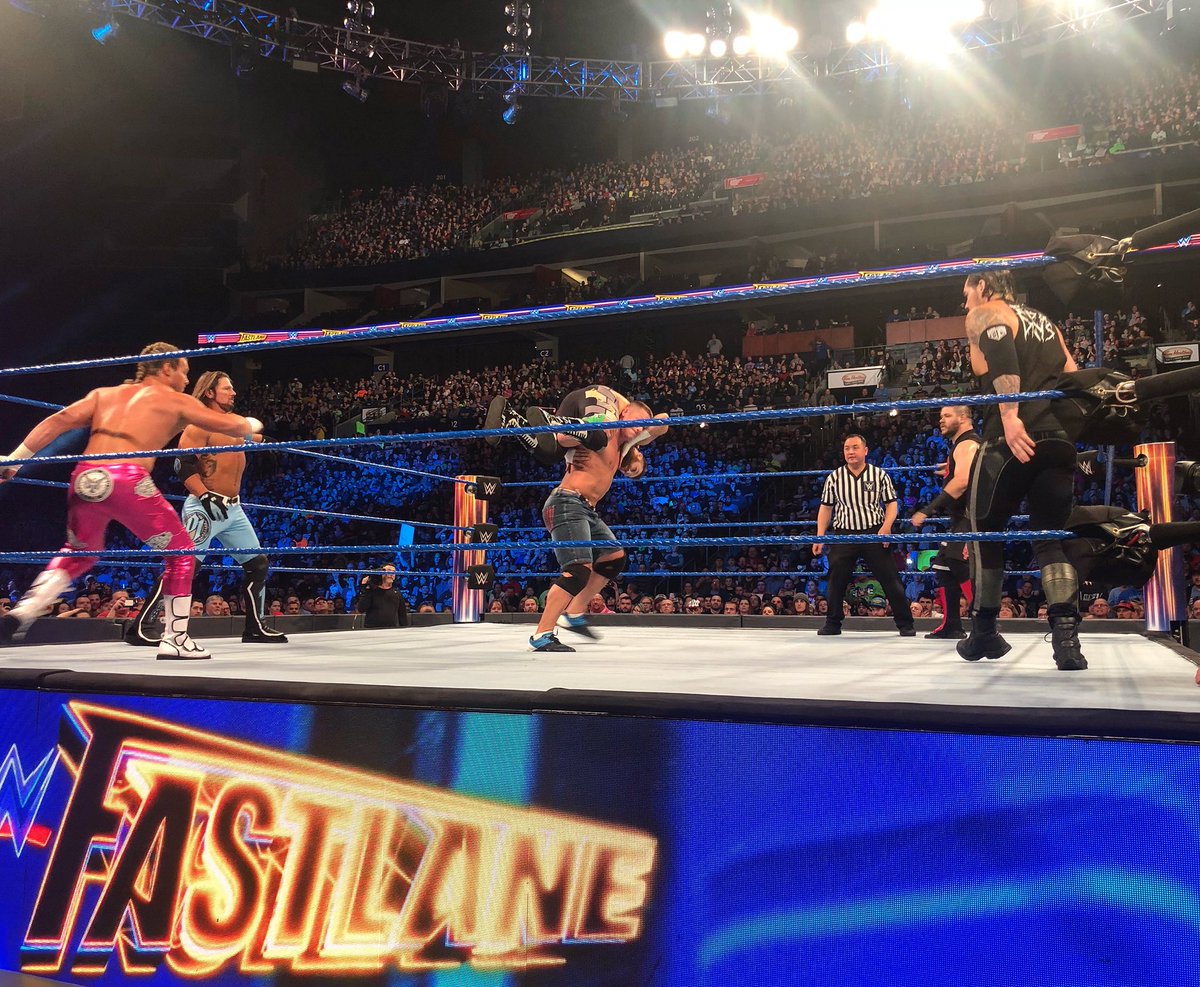 ظهرت مذيعة WWE رينيه يونج في بداية العرض مع الأسطورة بوكر تي والنجم ديفيد أوتونجا من أجل تحليل نزالات عرض فاست لين