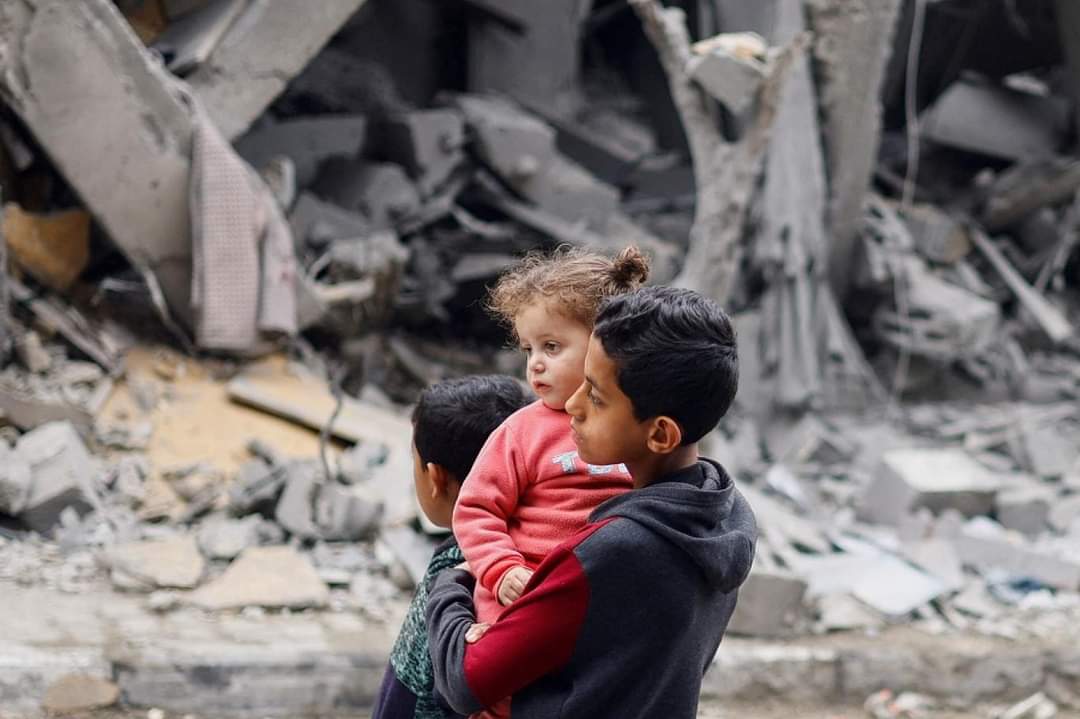 أطفال فلسطينيون قرب موقع غارة إسرائيلية على منزل برفح في 24 مارس 2024 (رويترز)