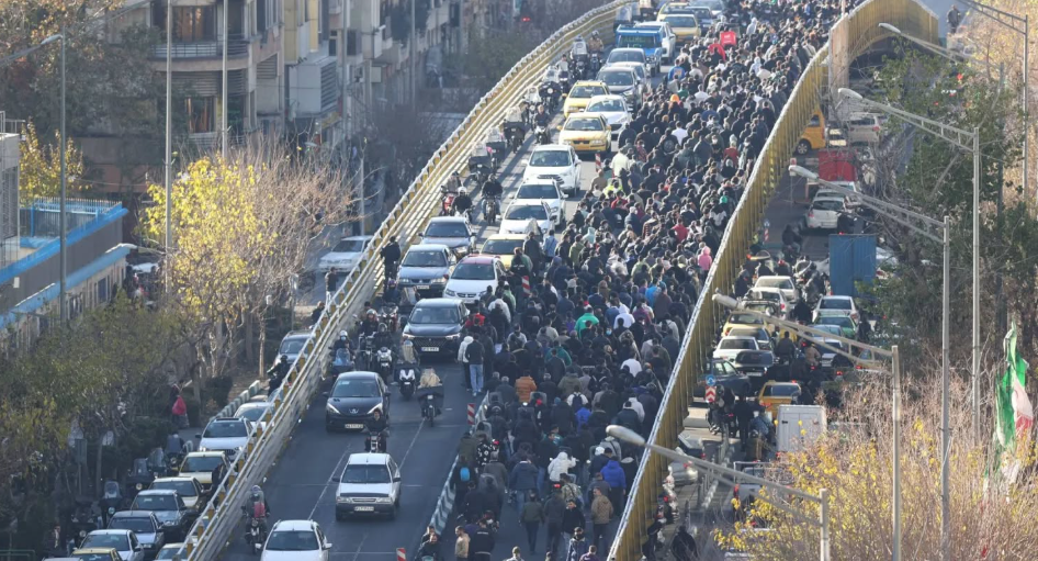 محتجون على جسر في طهران خلال التظاهرات اندلعت احتجاجاً على الأوضاع المعيشية (أ.ب)