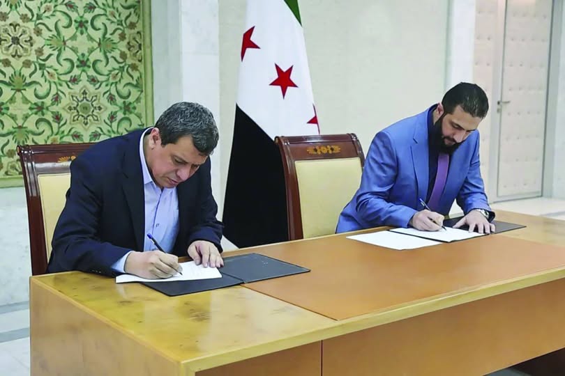 الشرع وعبدي خلال توقيع اتفاقية اندماج «قسد» بالجيش السوري في 10 مارس 2025 (إ.ب.أ)