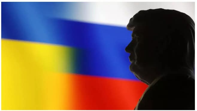 صورة ملتقطة في 15 يناير/كانون الثاني 2025 لنموذج مصغر مطبوع بتقنية ثلاثية الأبعاد للرئيس الأمريكي دونالد ترامب والعلمين الروسي والأوكراني. © رويترز.