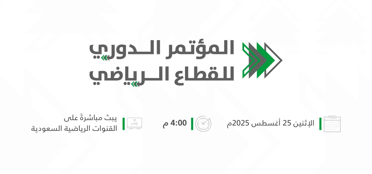 تعقد وزارة الرياضة، الاثنين، المؤتمر الصحافي الدوري للقطاع الرياضي، وذلك عند الساعة الرابعة عصراً في مجمع الأمير فيصل بن فهد الأولمبي بالرياض، بمشاركة عبد العزيز المسعد، وكيل شؤون الرياضة والشباب، وأنس دهلوي، المدير العام للتشغيل في وكالة المنشآت بوزارة الرياضة، وعمر مغربل، الرئيس التنفيذي لرابطة الدوري السعودي، ومتعب الأحمد، رئيس لجنة الاحتراف في الاتحاد السعودي لكرة القدم.