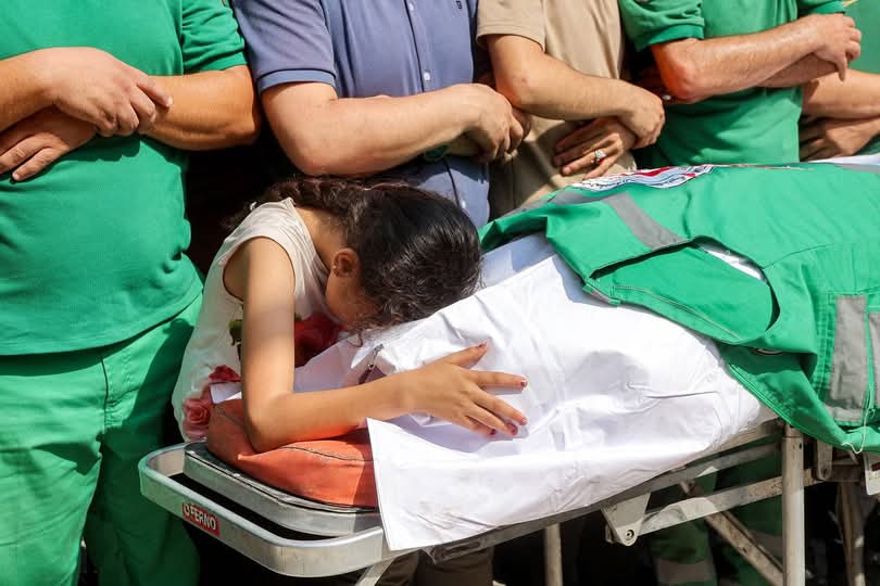 EDITORS NOTE: Graphic content / A girl mourns over the body of one of three paramedics killed the previous day by Israeli bombardment on the Tuffah neighbourhood, during the funeral at the Sheikh Radwan Clinic in the Sheikh Radwan neighbourhood of Gaza City on June 10, 2025. (Photo by Omar AL-QATTAA / AFP)