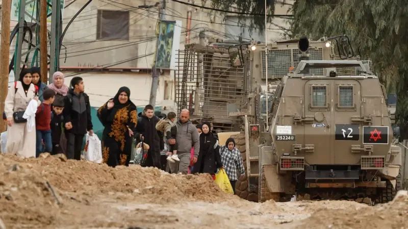 فلسطينيون يسيرون بجوار مدرعات إسرائيلية أثناء مغادرتهم مخيم جنين في الضفة الغربية التي تحتلها إسرائيل، في 22 يناير/كانون الثاني 2025صدر الصورة،Reuters