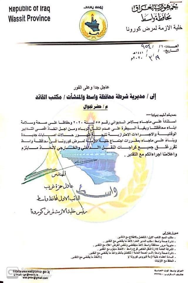 وبحسب وثائق رسمية تسلمها المربد فأن خلية الأزمة في واسط وبعد ظهور حالات جديدة مصابة بكورونا في المحافظة فأنها قررت “إغلاق جميع كراجات النقل الداخلي والخارجي كتدابير احترازية من تفشي المرض”، كما وأصدرت قرار يقضي بفرض غرامة مالية مقدارها (100000) مائة ألف دينار على صاحب كل مركبة يخرق الحظر وفي حال تكرار المخالفة سيتم حجز المركبة لمدة 30 يوماً، مؤكدة أن هذه الإجراءات تأتي للحفاظ على سلامة المواطنين من الإصابة بفيروس كورونا المستجد.