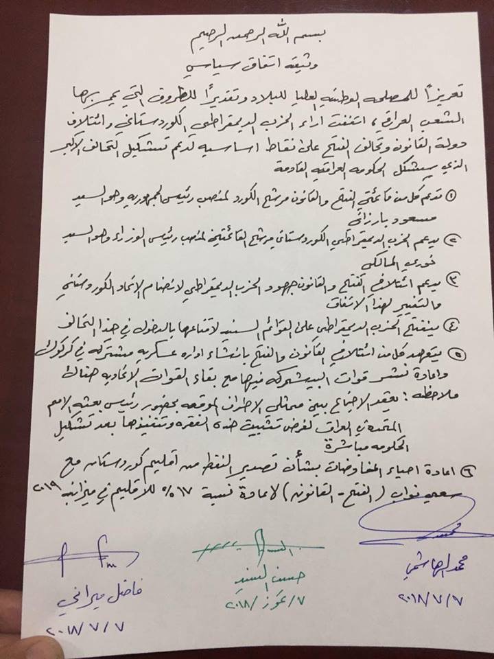 وذكر المكتب الاعلامي ل سكرتير المكتب السياسي للحزب الديمقراطي الكوردستاني فاضل ميراني في بيان ان “بعض المواقع الاخبارية وصفحات التواصل الاجتماعي، تداولت وثيقة تتضمن اتفاقاً سياسياً بين فاضل ميراني سكرتير المكتب السياسي للحزب الديمقراطي الكوردستاني وحسن السنيد ومحمد الهاشمي”.