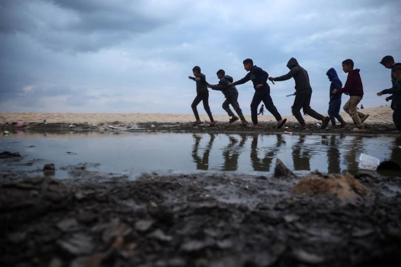 أطفال فلسطينيون نازحون يلعبون بالقرب من خيام على طول شاطئ في دير البلح في وسط قطاع غزة (أ ف ب)