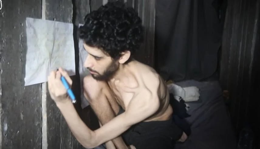 وفي المقطع، ظهر الأسير الإسرائيلي وهو يجلس على سرير في غرفة ضيقة بينما تظهر عليه علامات المجاعة وسوء التغذية، حيث برزت أضلاعه بشكل حاد نتيجة النقص الشديد في الوزن، في مشهد يعكس جانباً من سياسة التجويع التي تواصل إسرائيل تنفيذها بغزة.