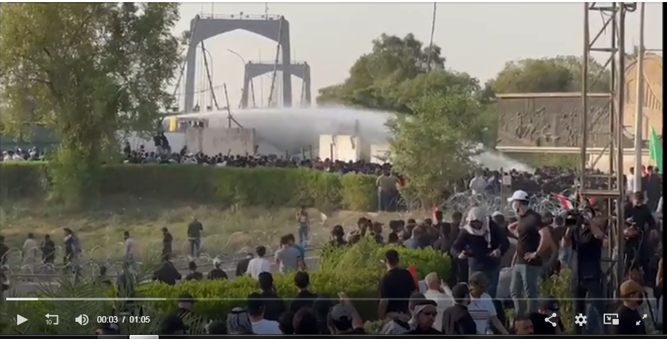 وقامت قوات الأمن العراقية برش المياه على المتظاهرين لمنعهم من عبور الجسر المؤدي إلى المنطقة الخضراء، بحسب صحافي في فرانس برس.