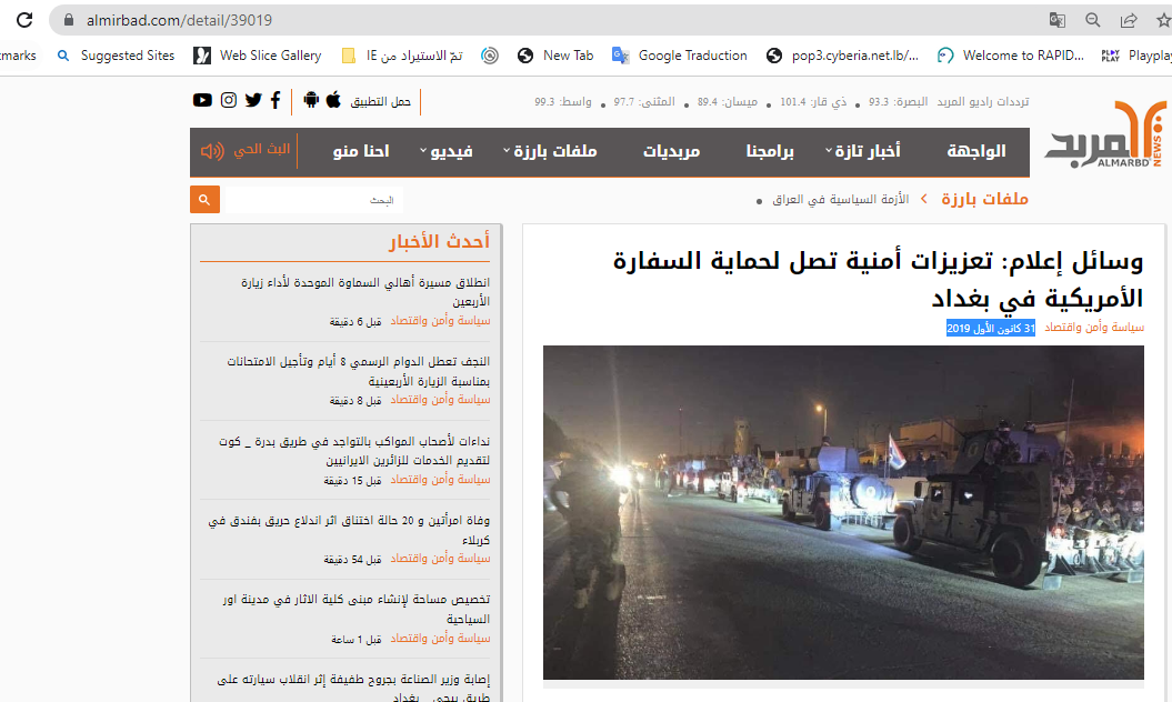 وقد نشر موقع “سي أن أن” الصورة في تقرير في 1 كانون الثاني 2020 (هنا)، وتظهر “دخول عدد من العربات المدرّعة التابعة لقوات مكافحة الإرهاب العراقية، إضافة الى سيارات عسكرية من نوع همفي”، المنطقة لتتمركز أمام السفارة الاميركية وحولها وداخل المنطقة الخضراء في بغداد، وذلك وفقا لما نقل عن مصدر موجود في محيط السفارة.
