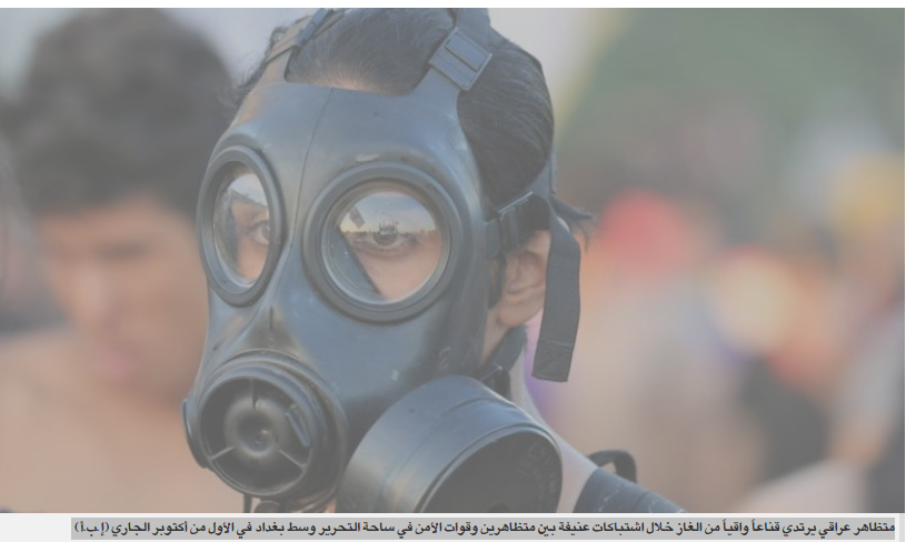 متظاهر عراقي يرتدي قناعاً واقياً من الغاز خلال اشتباكات عنيفة بين متظاهرين وقوات الأمن في ساحة التحرير وسط بغداد في الأول من أكتوبر الجاري (إ.ب.أ)بغداد: «الشرق الأوسط»