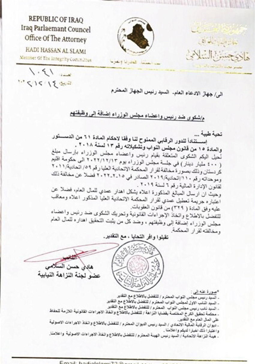 وأحال‭ ‬عضو‭ ‬لجنة‭ ‬النزاهة‭ ‬البرلمانية‭ ‬هادي‭ ‬السلامي‭ ‬الشكوى‭ ‬التي‭ ‬تشير‭ ‬إلى‭ ‬مخالفة‭ ‬السوداني‭ ‬قرارات‭ ‬المحكمة‭ ‬الاتحادية‭ ‬حيث‭ ‬أرسل‭ ‬مبلغ‭ ‬400‭ ‬مليار‭ ‬دينار‭ ‬عراقي‭ ‬إلى‭ ‬إقليم‭ ‬كردستان‭ ‬خلافا‭ ‬لقانون‭ ‬الإدارة‭ ‬المالية‭ ‬ولقرارات‭ ‬المحكمة‭ ‬الاتحادية‭ ‬التي‭ ‬تلزم‭ ‬الإقليم‭ ‬الكردي‭ ‬إيقاف‭ ‬تصدير‭ ‬نفطه‭ ‬وإعطاء‭ ‬الحكومة‭ ‬المركزية‭ ‬الحق‭ ‬المطلق‭ ‬بالإشراف‭ ‬على‭ ‬تصدير‭ ‬النفط‭ ‬من‭ ‬إقليم‭ ‬كردستان‭. ‬