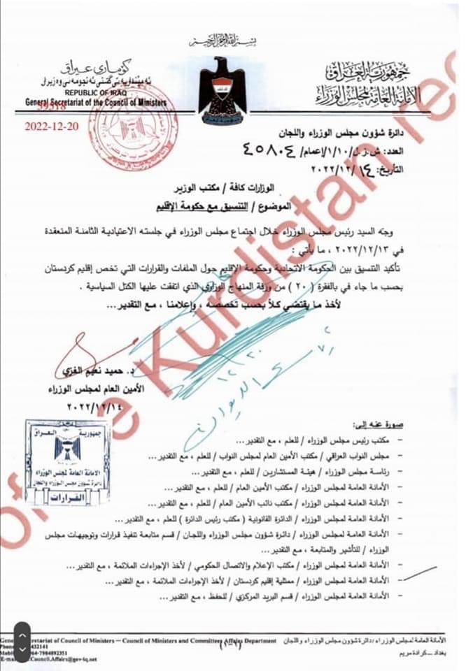 تأكيد التنسيق بين الحكومة الاتحادية وحكومة الإقليم حول الملفات والقرارات التي تخص إقليم كوردستان بحسب ما جاء في الفقرة (20) من ورقة المنهاج الوزاري الذي اتفقت عليه الكتل السياسية.