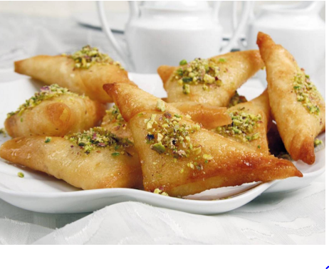 ترفع المثلثات من القطر وتصف في أطباق التقديم وتزين بالفستق الحلبي المطحون وتقدم فاترة.