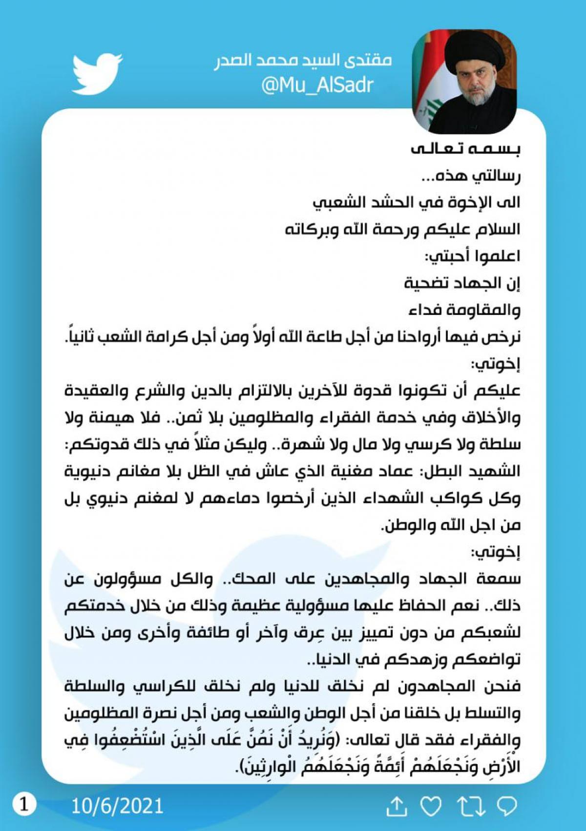 الصدر يوجه رسالة إلى الحشد الشعبي .. سمعة الجهاد والمجاهدين على المحك .. كونوا قدوة للآخرين