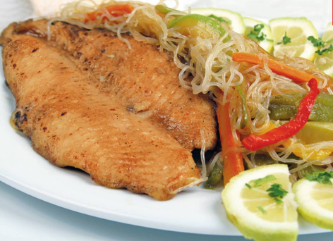 ثم تغمس شرائح السمك في الدقيق وتقلى في الزيت الساخن لتصبح ذهبية اللون ثم ترفع وتصفى على محارم ورقية. تذوب الزبدة وتخلط مع الخل البلسمي. تغمس كل شريحة سمك في هذه الصلصة وتقدم مع مجموعة منوعة من الخضار والنودلز الشفاف.