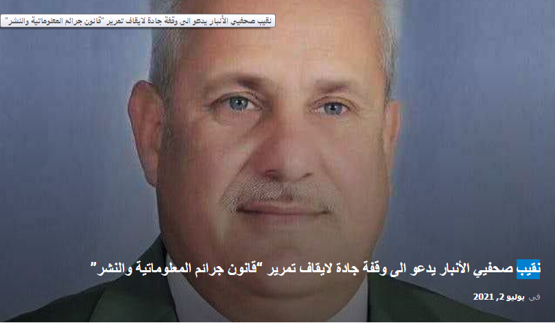 المستقلة/-حامد شهاب/..دعا نقيب صحفيي الأنبار أحمد الراشد كل الجهات الصحفية والإعلامية الى وقفة جادة ، لكي لايتم تمرير قانون جرائم المعلوماتية في مجلس النواب، دون أن يكون لأصحاب الشأن والكلمة الحرة وكل المختصين بالحريات الصحفية موقف مؤثر ومسؤول، في عدم السماح بتمرير هذا القانون الذي تم تأجيل التصويت عليه في مجلس النواب يوم الخميس الأول من تموز 2021 الى إشعار آخر.