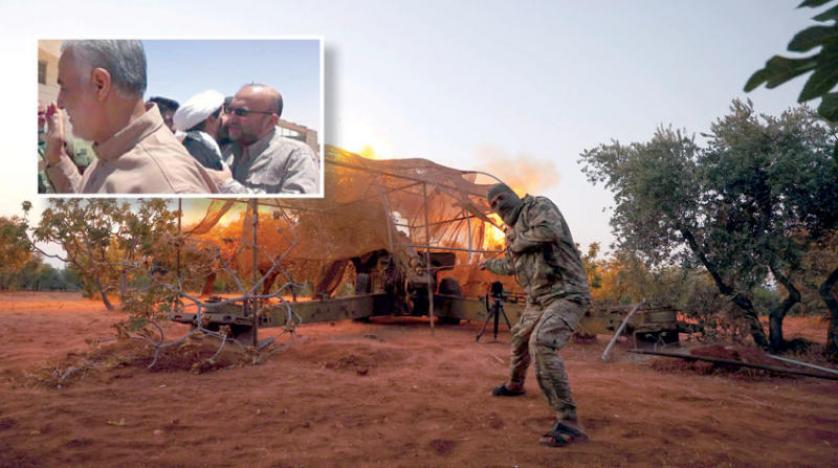 مقاتلون معارضون يطلقون قذائف مدفعية جنوب إدلب ليل الجمعة – السبت (أ.ف.ب) وفي الإطار القيادي في «الحرس» الإيراني سيد أحمد قريشي مع قاسم سليمانيإدلب: فراس كرم