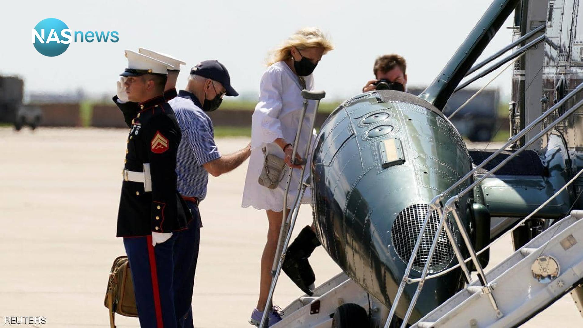 رصدت عدسات المصورين السيدة الأولى في الولايات المتحدة جيل بايدن، وهي تستند إلى عكاز وتستعين بزوجها الرئيس جو بايدن، أثناء صعودها مروحية رئاسية.