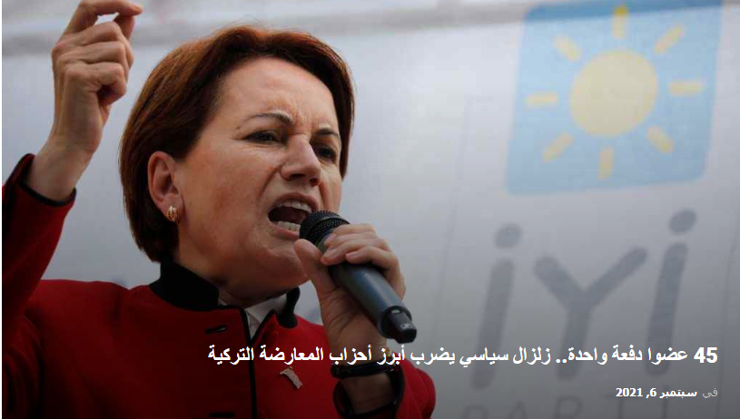 المستقلة /- نقلت وسائل الإعلام التركية نبأ استقالة 45 عضو دفعة واحدة من حزب الجيد المعارض الذي تترأسه ميرال أكشنر، وذلك بعد سلسلة استقالات عاشها الحزب خلال الآونة الأخيرة .