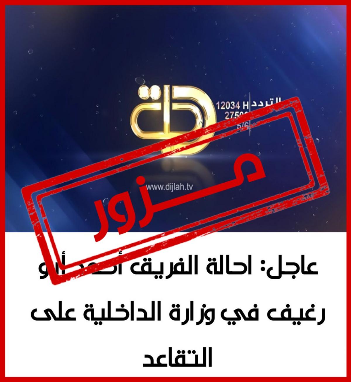 تنفي قناة دجلة الفضائية وموقعها الاخباري ما تم تداوله في إحدى صفحات التواصل بشأن إحالة الفريق في وزارة الداخلية أحمد أبو رغيف على التقاعد، وتؤكد ما نقل عنها “مزور”.وادناه النص المزور..