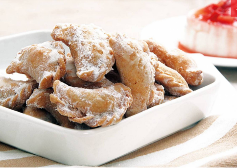 تحشى كل دائرة عجين بمقدار ملعقة صغيرة من الحشوة، ثم تطوى العجينة فوق الحشوة على شكل هلال. تزخرف حواف الهلال.
