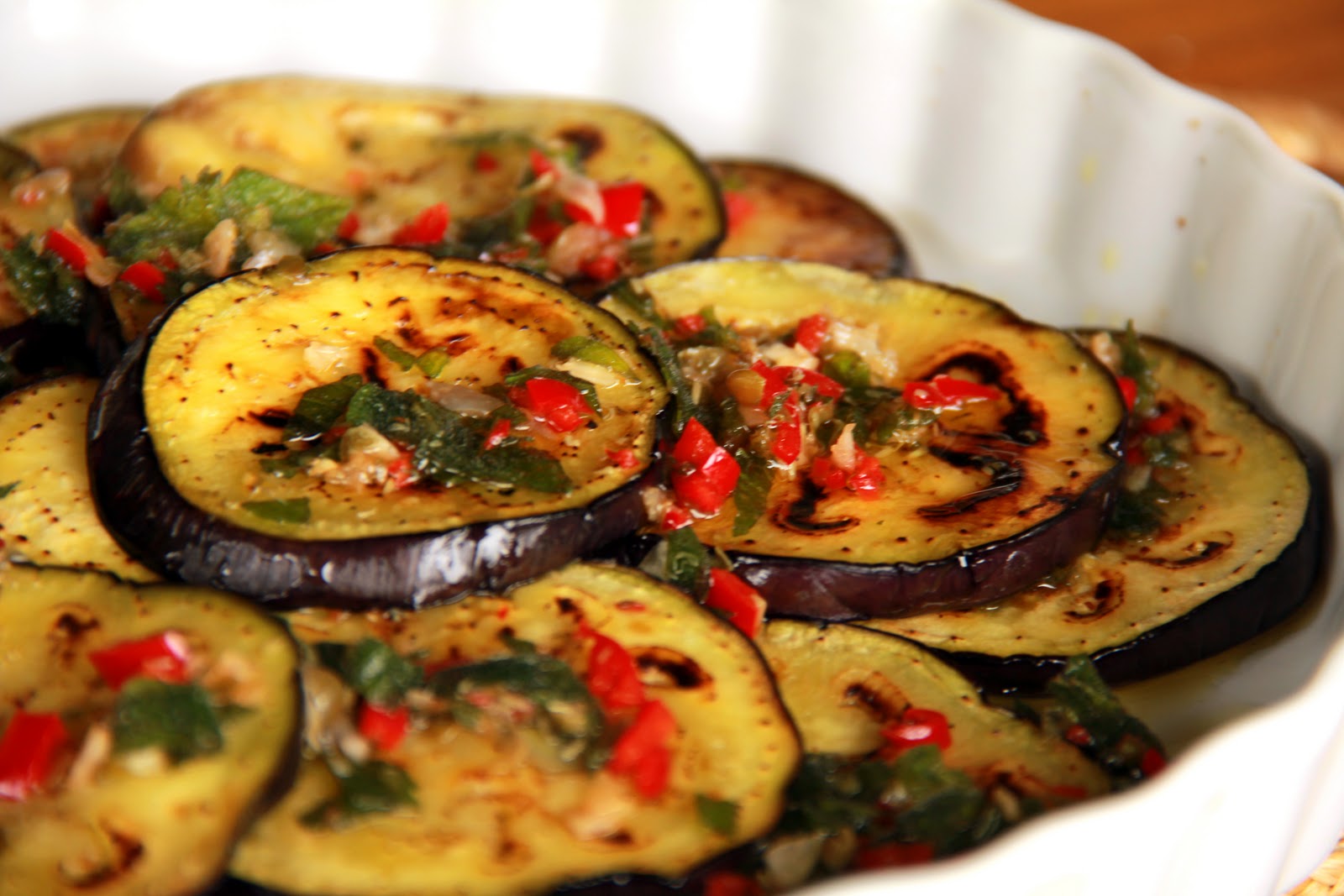 – نقوم بدق الثوم ناعماً مع القليل من الملح، ثم نضيف إليه الشطة الناعمة، ويتبل الباذنجان بهذا الخليط.