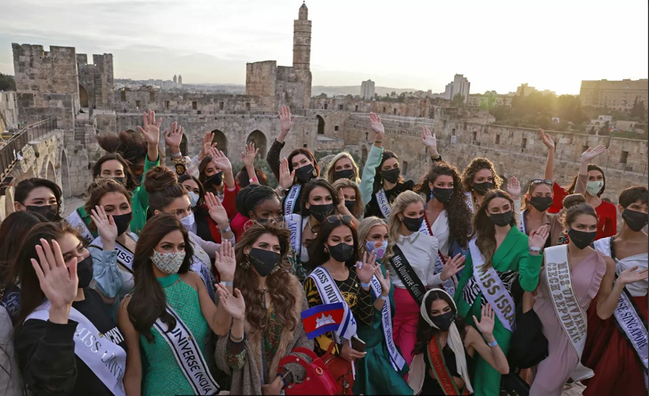 قبل مسابقة ملكة الجمال السنوية التي ستقام في منتجع إيلات على البحر الأحمر في 30 نوفمبر 2021 ، سار متسابقات ملكة جمال الكون بجوار برج داود في البلدة القديمة في القدس اليوم وعبرن عن فرحهن اثناء الاستعداد للمسابقة .