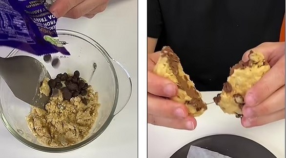 أخيرًا، يضع العجين في طبق آمن للاستخدام في الميكروويف مبطن بورق الخبز ، ويقوم بطهيه في الميكروويف لمدة دقيقة واحدة.