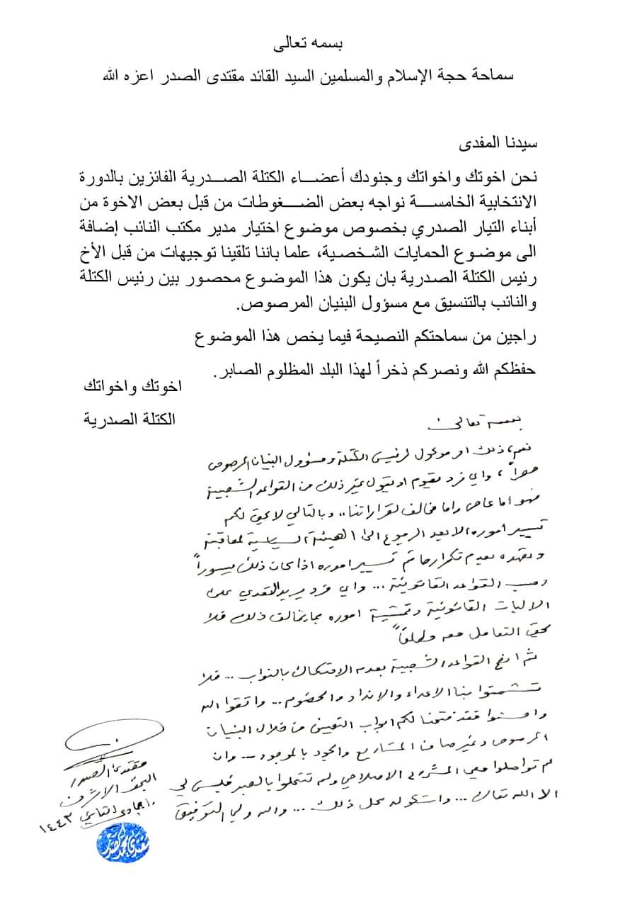كما ونصح الصدر بحسب الوثيقة، القواعد الشعبية إلى عدم الاحتكاك بالنواب والتحلي بالصبر للاستمرار بإكمال المشروع الإصلاحي.