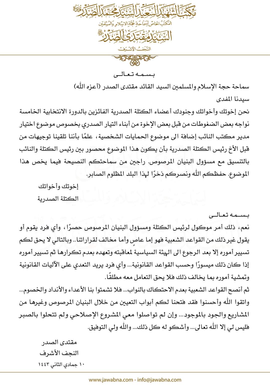 جاء ذلك في رد على سؤال للكتلة الصدرية بشأن اختيار مدير مكتب النائب والحمايات الشخصية، حيث أوضح الصدر في وثيقة حصل NRT عربية على نسخة منها اليوم، (14 كانون الثاني 2022)، بان اختيار مدير مكتب النائب والحمايات الشخصية امر موكول لرئيس الكتلة الصدرية ومسؤول البنيان المرصوص حصرا.